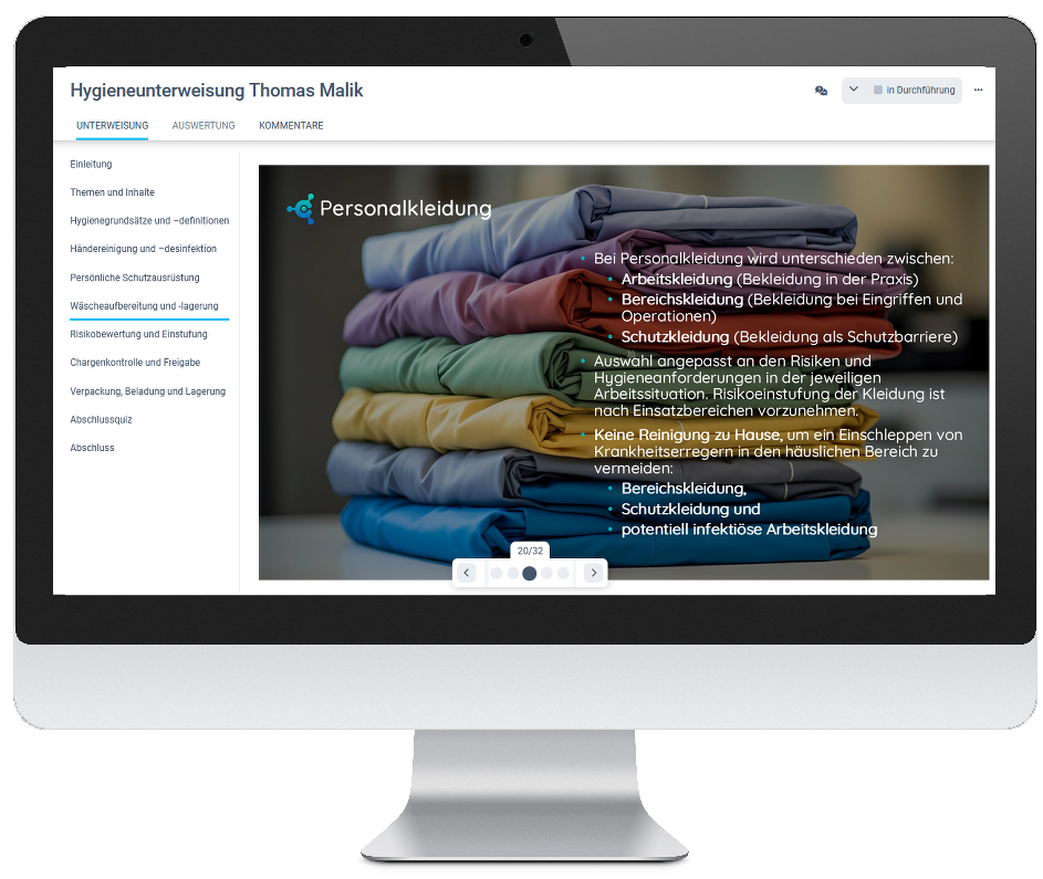Informieren Sie sich mithilfe der Tabs 1-13 über unsere Inhalte der oben aufgelisteten Unterweisungen. Als Experten für die Medizin, das Sozial- und Gesundheitswesen sind unsere Inhalte perfekt auf die spezifischen Anforderungen aus Gesetzen, Verordnungen, Richtlinien und Gegebenheiten abgestimmt. Die unterwiesenen Mitarbeiter*innen profitieren von praxisnahen und spezifischen Inhalten, die auf den typischen Arbeitsalltag transferiert werden können.